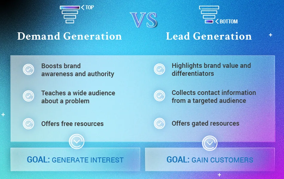 - Focus: Demand generation builds trust at the top of the funnel; lead generation captures high intent leads at the bottom.